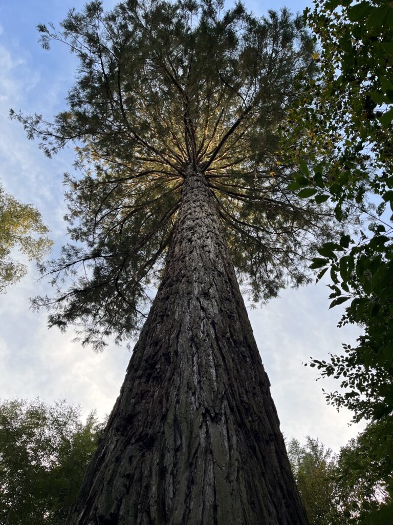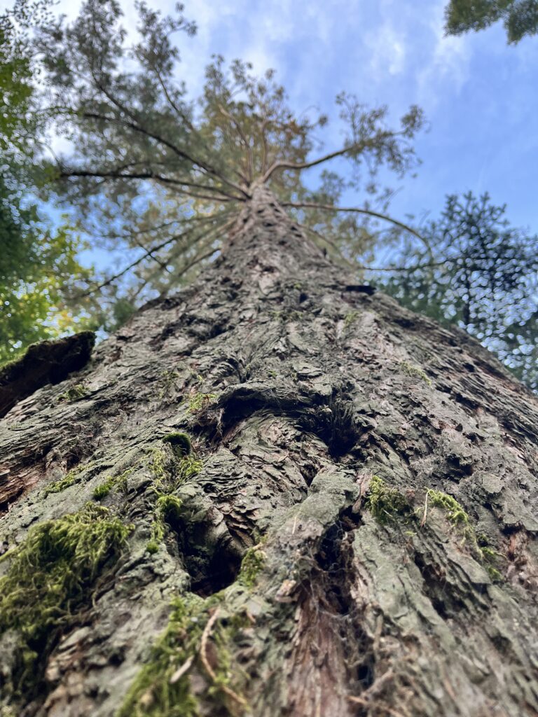 Uralten Sequoia Gigant umarmt. Versucht zu umarmen. Grob geschätzter Stammumfang: um die zehn Meter, wenigstens. Vielleicht. Höhe: mindestens 25 Meter, vielleicht auch 30.