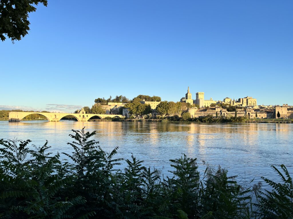 Gibt es nicht? Sollte es aber. Ich hatte es erfolgreich verdrängt, das monotone on y danse, on y danse, dass ich schon als Dreijährige in perfektem Französisch trällern konnte. Aber an diesem spätsommerlichen Vormittag ohne Wolken plärrt es UNUNTERBROCHEN aus den Lautsprechern monströser, kaum besetzter Ausflugsdampfer. Ein unschuldiger Knabenchor in Dauerschleife schallt übers Wasser – man möchte sich in der Rhône ersäufen.